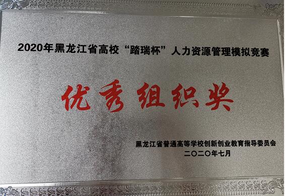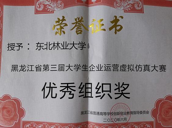 2020年春季学期黑龙江省普通高等学校创新创业教育指导委员会决定表彰东北林业大学为黑龙江省第三届大学生企业运营虚拟仿真大赛、2020年黑龙江省高校“踏瑞杯”人力资源管理模拟竞赛优秀组织单位,并颁发了优秀组织奖。