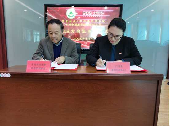 2020年11月4日上午,经济管理学院与中博教育集团隆重举行会计学ACCA方向班签约仪式。东北林业大学教务处副处长葛冰,经济管理学院院长耿玉德、副院长黄颖利、副院长马国勇、党委副书记副院长张艳波、会计学专业负责人丁华、中博教育常务副总裁萨仁娜、中博教育东北区校企合作总监刘之光、中博教育黑龙江省分公司总经理孟巍巍参加了签约仪式。签约仪式的举行标志着双方在培养具有良好职业素养、创新精神和国际视野的复合型财经人才方面迈出了实质性的一步。