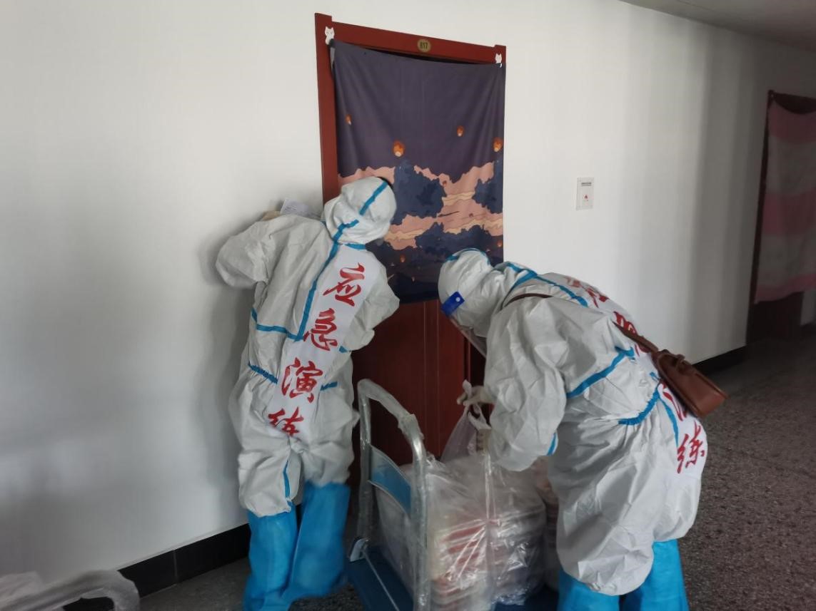3月27日14:00疫情防控演练正式开始,经济管理学院教师志愿者们迅速抵达负责楼层并熟悉所在楼层各寝室情况。教师志愿者们充分协作,根据同学们不同的需求运送瓶装水和垃圾袋,并分发简餐、民族餐与普通餐,同时在平面图上做好标记。整个发放过程有条不紊,高效有序,充分体现了教师志愿者们极高的组织性、纪律性,保证了整个疫情防控演练工作的顺利进行。待用餐结束后,楼层志愿者回收各寝室垃圾统一装至垃圾袋中,并在袋口喷消毒剂后,将垃圾袋运送至一楼大厅门外。长达近五个小时的演练,身着防护服教师志愿者们的衣物早已被汗水浸湿,但他们仍用自己的实际行动站好最后一班岗,直至整个疫情防控演练工作圆满结束。本次演练中教师志愿者们不辞辛劳,冲锋在疫情防控第一线的身影为同学们上了生动一课,树立了人民教师走下讲台,育人更育德的良好形象。