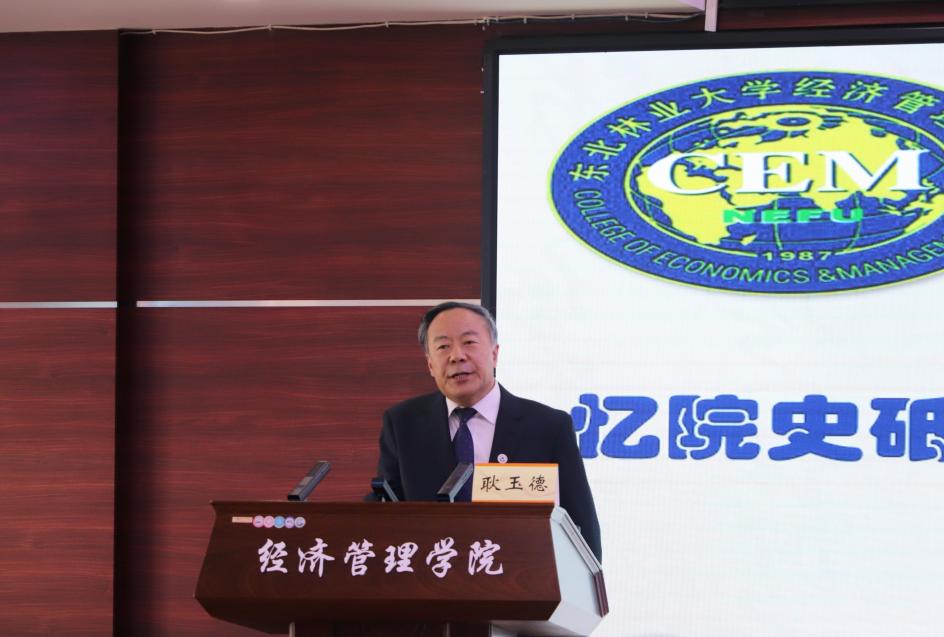 耿玉德从“溯源、成长、展望”三个方面,分别回顾了从60多年前的林业经济学科到如今的经济管理学院的发展历程。就“东北林学院成为全国林业经济学科的发祥地”这个主题,耿玉德从1955年9月学校开办“林业经济研究班”“林业经济教师进修班”讲起,介绍了林业经济教研室创始人克服困难、独立办学的感人故事。详细介绍了建院后学校领导鼎力支持学院“争办林经管博士点”等重要历史事件,悉数了为学院发展、学科建设作出卓越贡献的黄清、蒋敏元、刘国成等老一辈东林人的优秀事迹。他以“发展”为主线,向师生校友介绍了近年来学院发展建设的重要成果、涌现出的优秀学生榜样和校友典型。