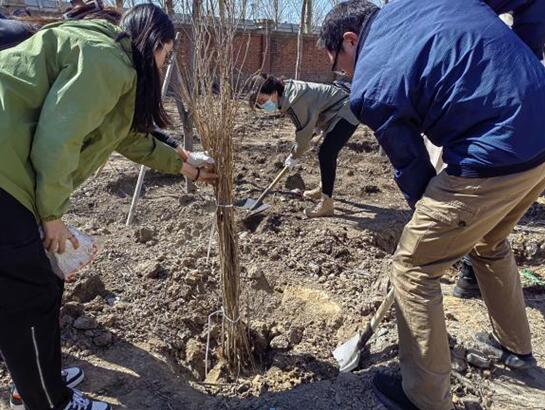 植树现场呈现一派热火朝天的劳动景象,老师和同学们三五成组、分工协同。大家分工合作、相互配合,仔细认真地完成植树的每一道工序。大家拿着工具,一边了解挖坑技术要点,一边精心细致操作,铲土挖坑、踩边修整,浇水灌根......各个环节衔接有序、配合默契。每道工序都认真细致,一丝不苟,整个劳动场面繁忙而有序。