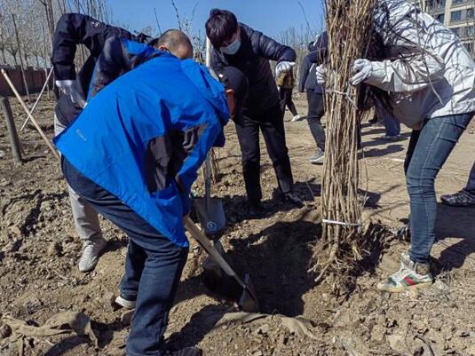 经过一上午紧张劳作,一株株小树苗整齐排列,本次植树共种植了200余棵丁香树苗,挺立在四月和熙的春风里。放眼望去,明媚的春光中,一排排新栽下的树苗迎风挺立,处处焕发勃勃生机。