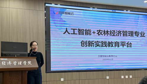 为主动应对数字经济发展对商科人才提出的新要求,探索人工智能技术与经管类专业深度融合的创新路径,2025年11月26日,经济管理学院特邀百度智能云教育团队做客我院博雅论坛,于主东502会议室举办“人工智能+农林经济管理专业创新实践教育平台”专题讲座。本次讲座由教学院长卢宏亮主持,学院全体专任教师参会学习。