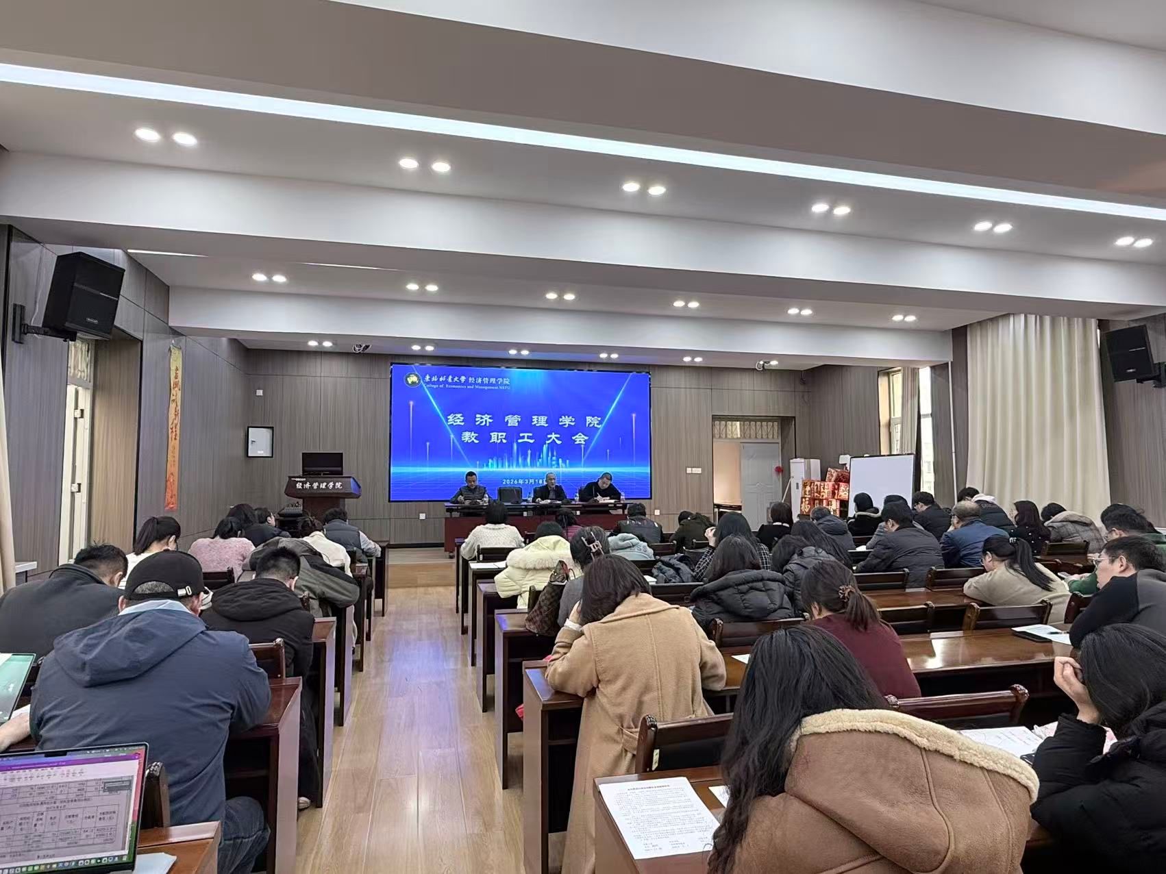 为深入学习贯彻习近平总书记关于干部担当作为的重要论述,全面落实学校新学期工作部署,统筹推进学院教学、科研、人才培养、师德师风等各方面工作高质量发展,2026年3月18日下午,经济管理学院在主东502会议室召开了全体教职工大会。