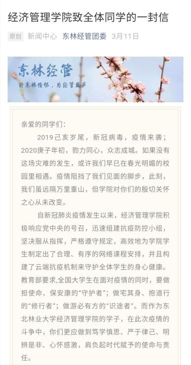 此外,我院积极配合校团委工作,组织建立了东北林业大学经济管理学院湖北籍学生临时团支部。团支部定期开展线上交流,将爱与问候带给学生,让他们在疫情期间感受到别样的温暖。