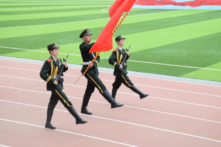 各方阵检阅完毕后,进行了庄严的升国旗仪式。庄严肃穆的国歌缓缓奏响,全体成员起立行注目礼,五星红旗在微风中徐徐升起。