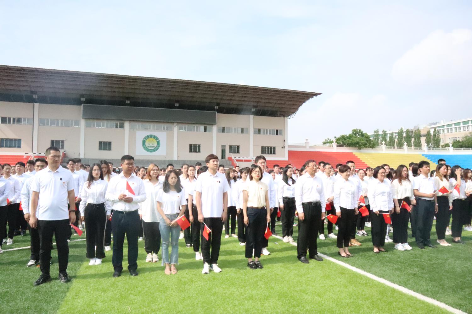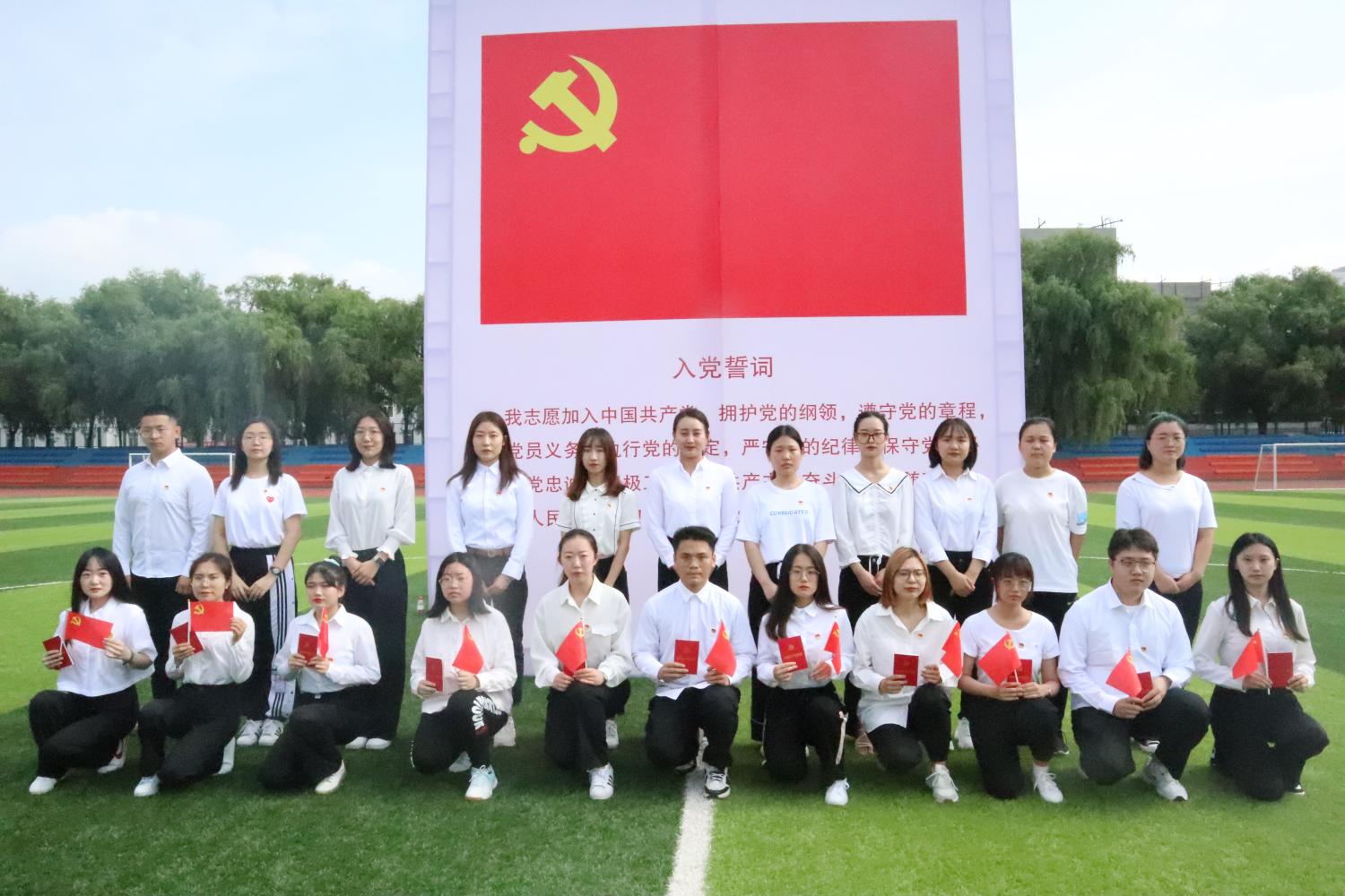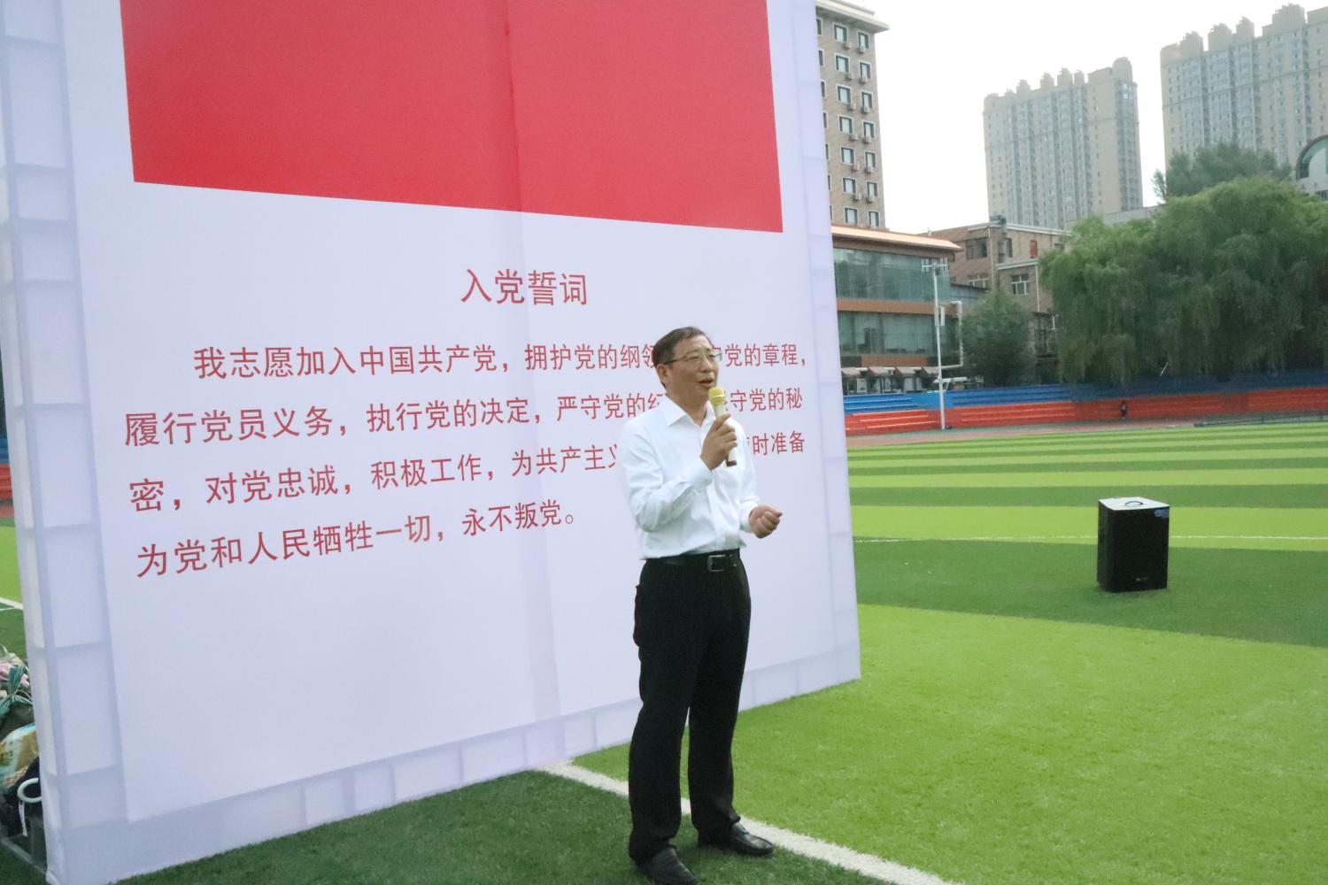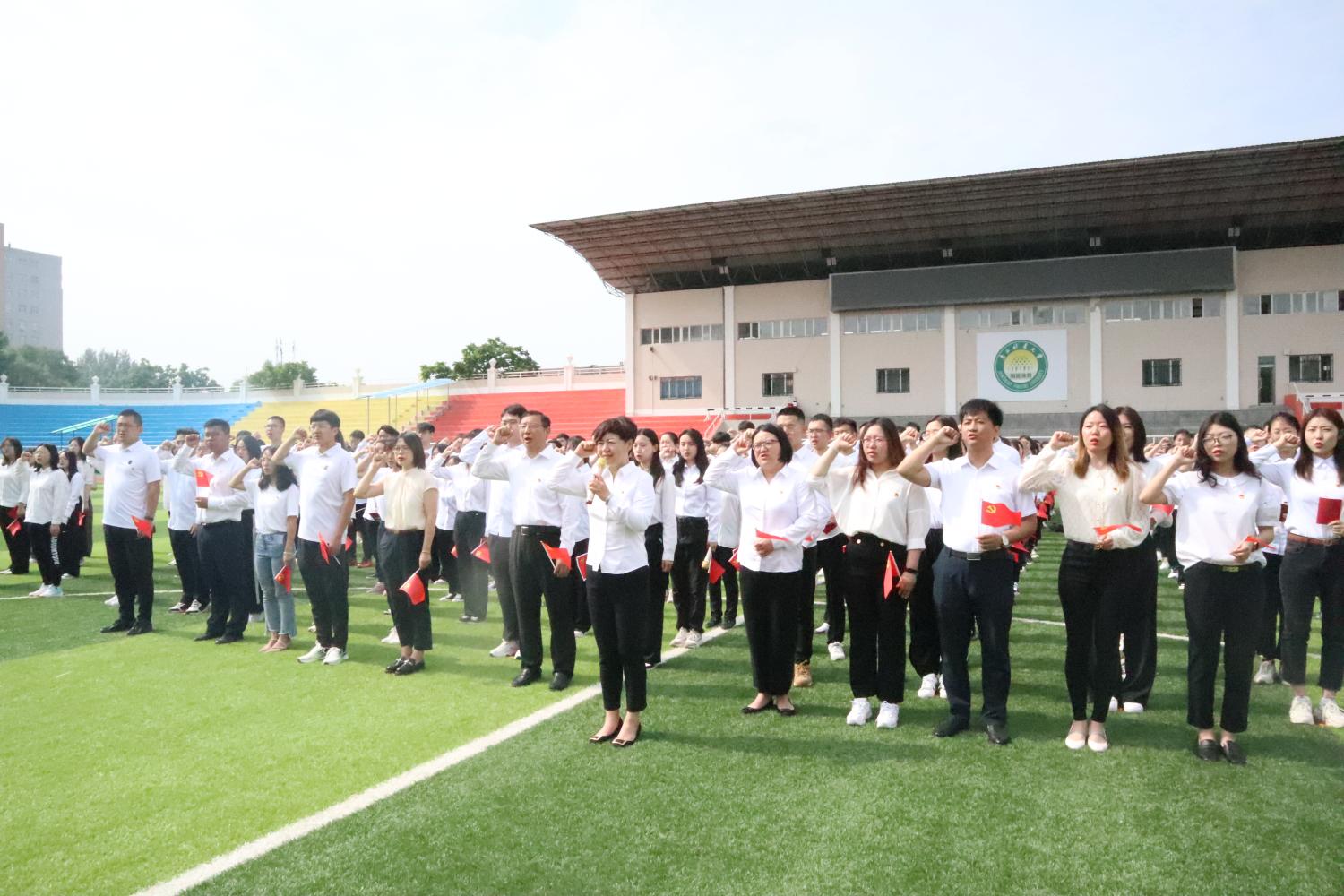 田径场上响起铿锵有力的宣誓声,在张艳波副书记的带领下,500多名新老党员,整齐列队,佩戴党徽,举起右拳,面向党旗,庄严宣誓。铮铮誓言,字字铿锵,表达了每一名新党员对党的忠心和为共产主义事业奋斗终生的决心。