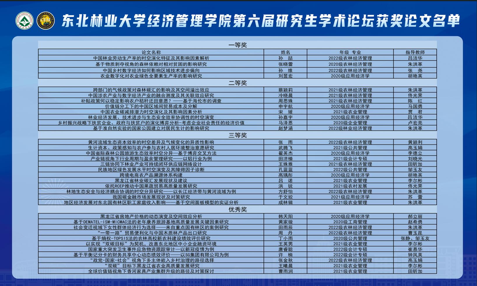 自2023年5月发布征稿通知以来,论坛得到东北林业大学经济管理学院研究生积极响应,共征得有效稿件40余篇。经主办方聘请有关专家进行严格评审后,现公布东北林业大学经济管理学院第六届研究生学术论坛获奖结果。