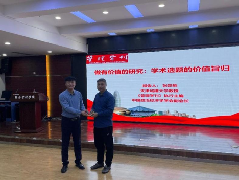 在论坛正式开始前,尚院长首先向与会师生介绍张跃胜教授。张跃胜教授目前担任《管理学刊》执行主编、中国政治经济学学会副会长,出版著作10余部,主持国家和省部级项目20余项,获得省部级以上成果奖励8项,发表论文80余篇,向各级政府提供咨政建议若干,曾获中央机构采纳。张老师不仅在学术界享有盛誉,还拥有丰富的学术研究和期刊编辑经验。
