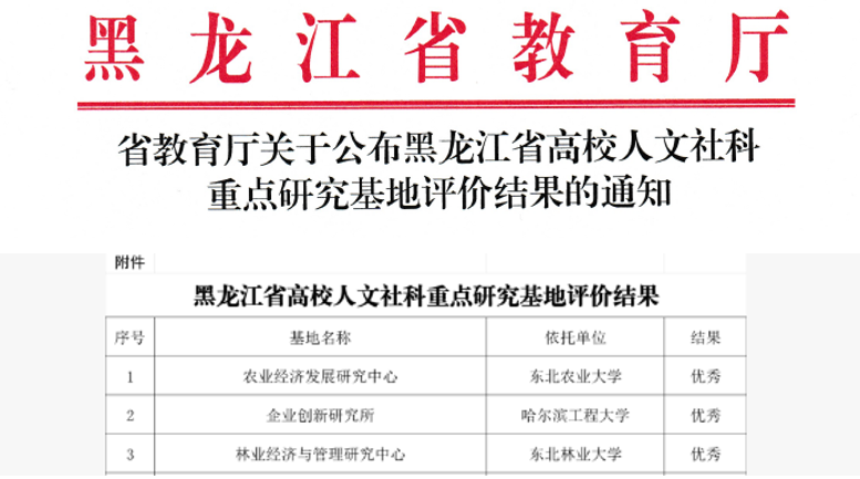 近日,黑龙江省教育厅正式公布了全省高校人文社会科学重点研究基地评价结果,依托我院建设的“林业经济与管理研究中心”凭借卓越的综合实力,在本次评估中获评“优秀”等级,跻身全省8个优秀基地之列,为我校和我院赢得了重要荣誉。