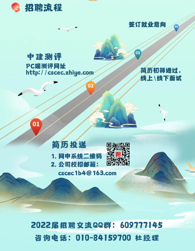 应聘方式: 1.网申:登录中建一局招聘网:http://cscec1b.zhiye.com,在“校园招聘”项下:注册账号--选择公司--投递简历--填写简历。 2.笔试:登录中国建筑高校毕业生接收考试网:http://cscec.pincn.com,开始报名--登录系统--提交申请--完成一测--完成二测。 (温馨提示:1.招聘系统与考试系统账号密码一致;2.第二轮测试为统一时间测试,未通过第一轮测试的同学无法收到第二轮测试通知;3.具体笔试时间以及注意事项请参照国建筑高校毕业生接收考试网;4.请您务必注意不同面试站点的申请截止时间,逾期申请可能无法被系统识别;5.毕业生可申请不超过3个公司的职位;6.简历投递后,为方便我们联系,请不要更改电话号码和电子邮箱,否则将无法通知到您。) 3.参加宣讲会,对中建一局进一步了解。 4.宣讲会结束会收到面试通知,携带相关材料参加现场面试。 5.面试通过后,即可签约加盟。