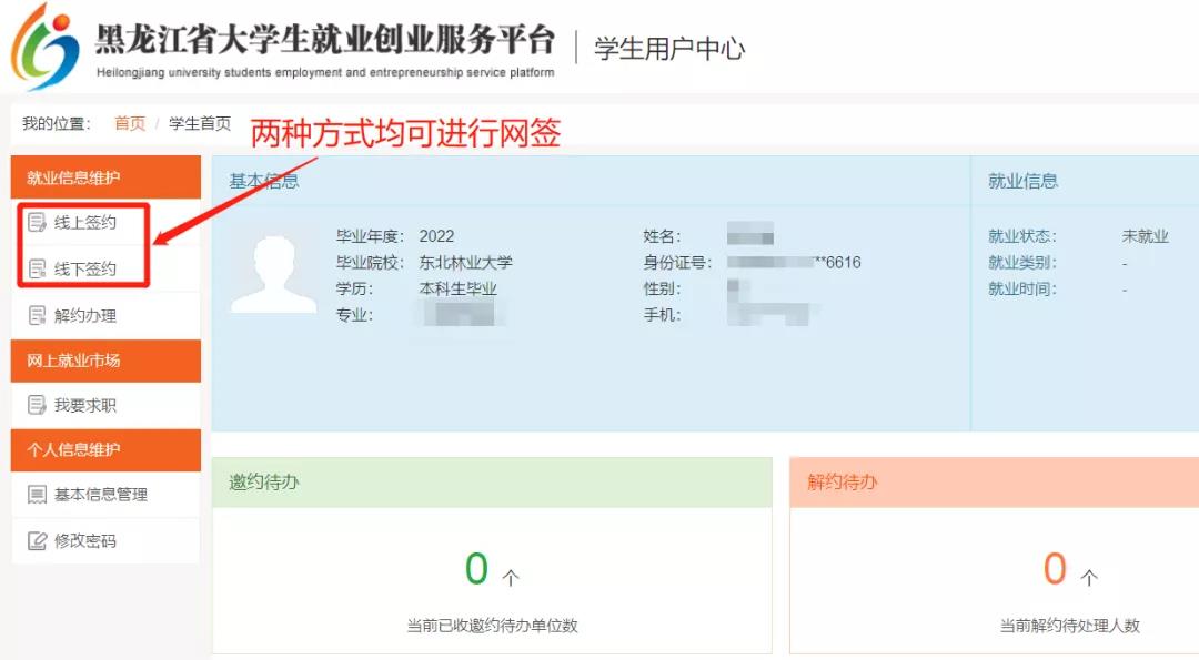 依托“黑龙江省大学生就业创业服务平台”网上签约系统,签约可分为线上签约和线下签约两种形式。